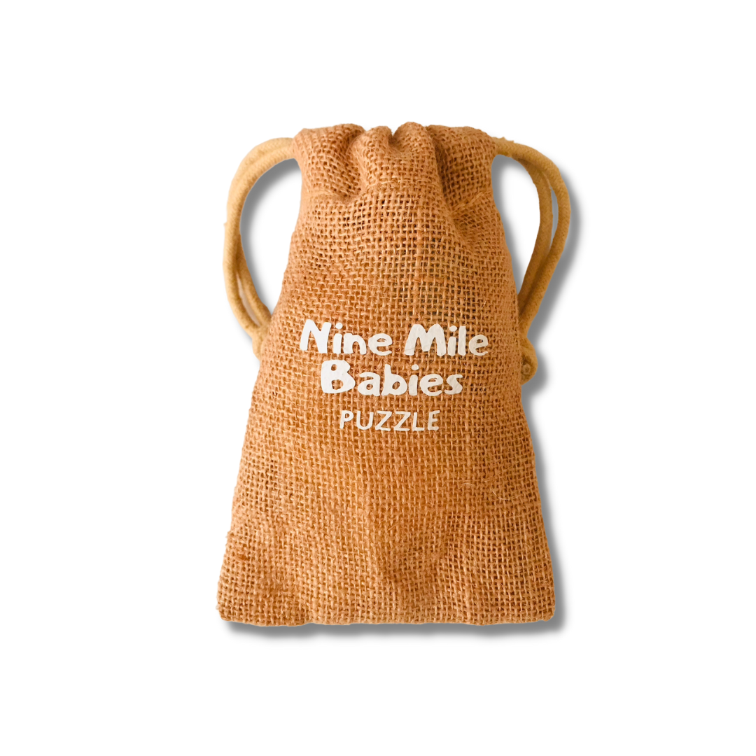 Each wooden jigsaw puzzle has 25 pieces starring Nine Mile Babies characters like Prinny Pie, Juls and Crissy. Once you’ve puzzled together this colourful wooden jigsaw puzzle, you can pack up the pieces in the d jute storage bag. Nine Mile Babies Wooden Puzzles are made with durable wooden pieces. This wooden toy is sized just right for little hands.