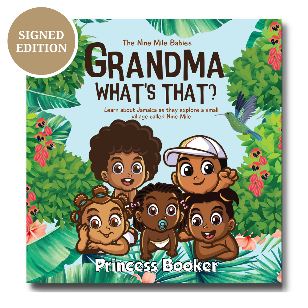 "Grandma What's That?" signed edition copy by the author Princess Booker. This adds a personal touch to the book and makes it a special keepsake for those who love the story and its message. The signed edition copy is a great gift for children who enjoy reading and learning about different cultures, and it's also a lovely addition to any personal library.